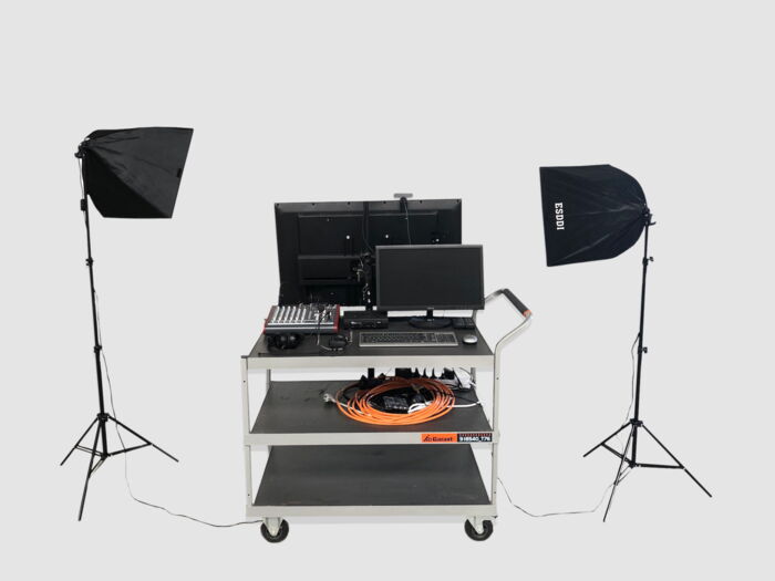 Am Ende entstand daraus ein mobiler Webinar-Trolley, mit dem wir unsere Live-Vorstellungen in der kompletten Firma abhalten können. Es soll gesagt sein, dass aus professioneller Sicht, wir die Vorführungen immer zu zweit abhalten. Es gibt immer einen aktiven Moderator, der verantwortlich für das Thema ist und einen weiteren Kollegen, der im Hintergrund die Regie übernimmt und am Ende der Vorführung die aufkommenden Fragen dem Moderator zuspielt.